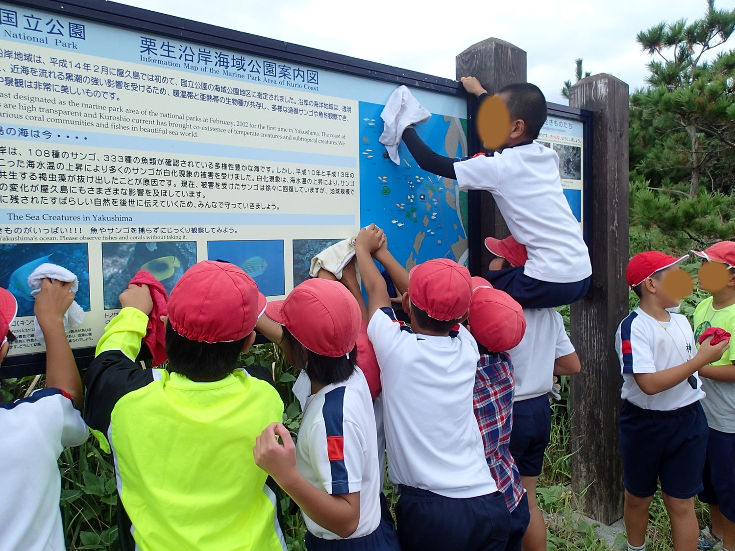 またレンジャーのお仕事体験として、海岸調査やゴミ拾い、看板清掃をしてもらいました。