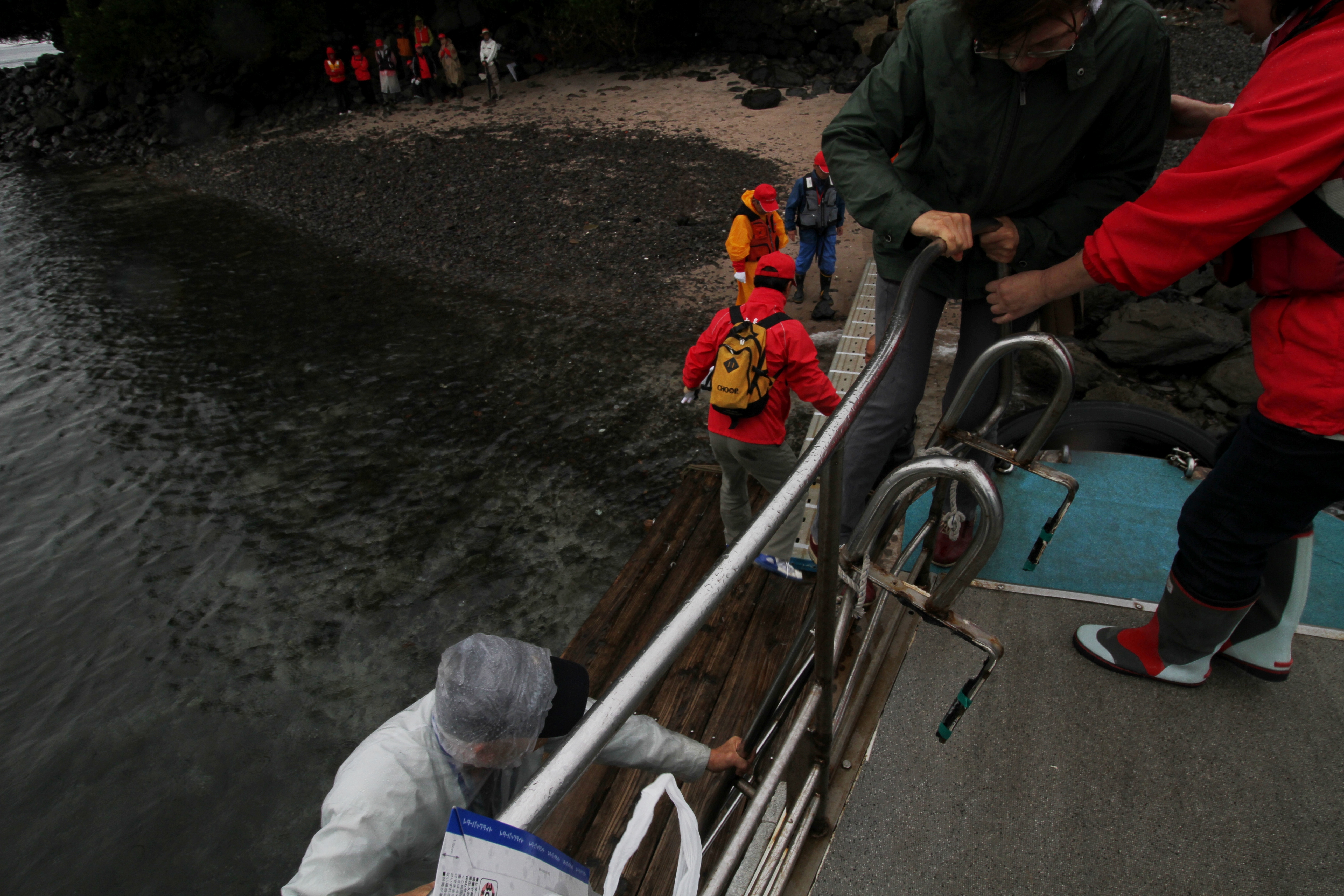 そこには桟橋もなくこの日のために簡易の浮き桟橋を準備しました。浮き桟橋と島とつなげる工事用足場が不安定だったので落水等の事故を心配しましたが無事上陸。