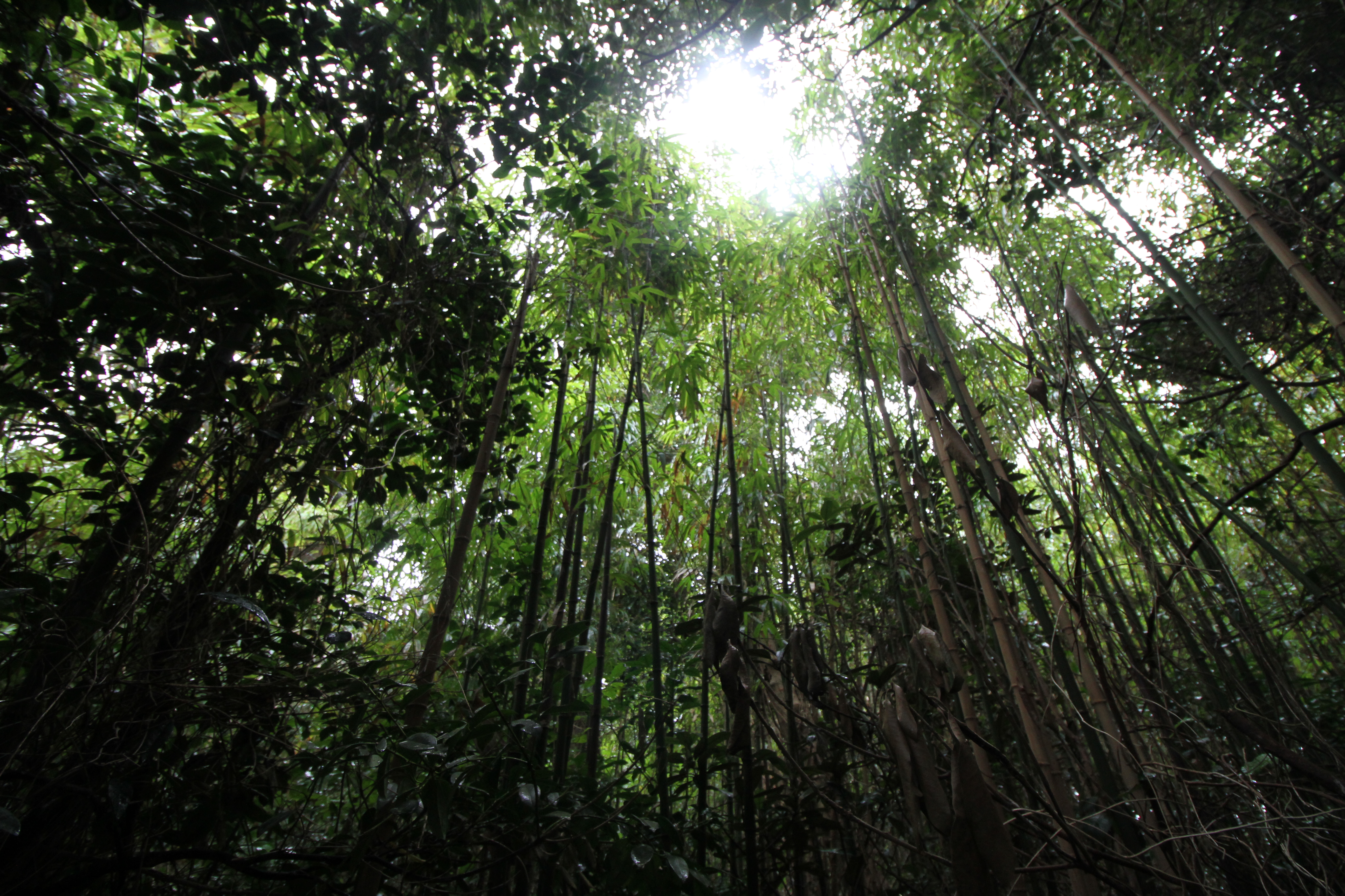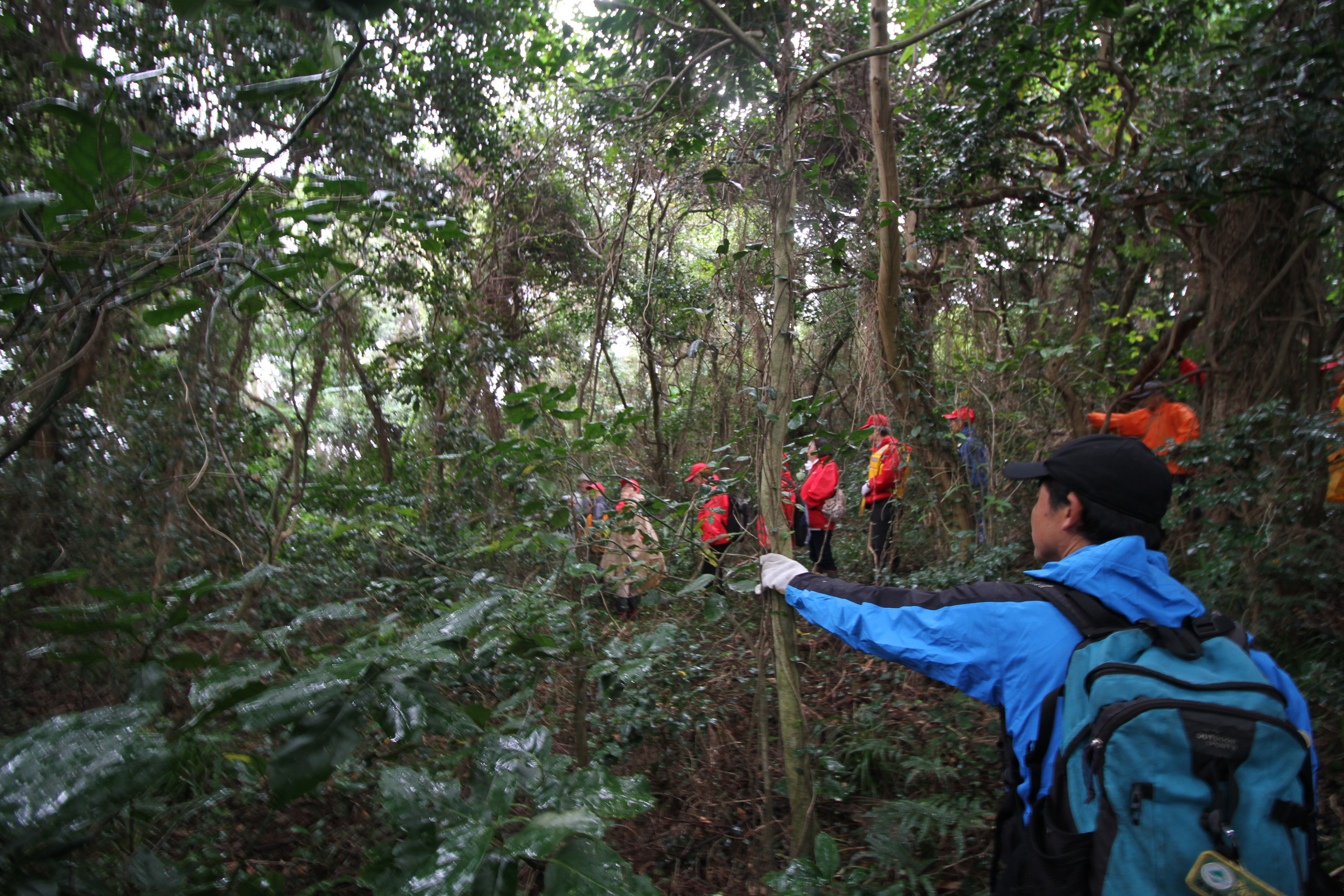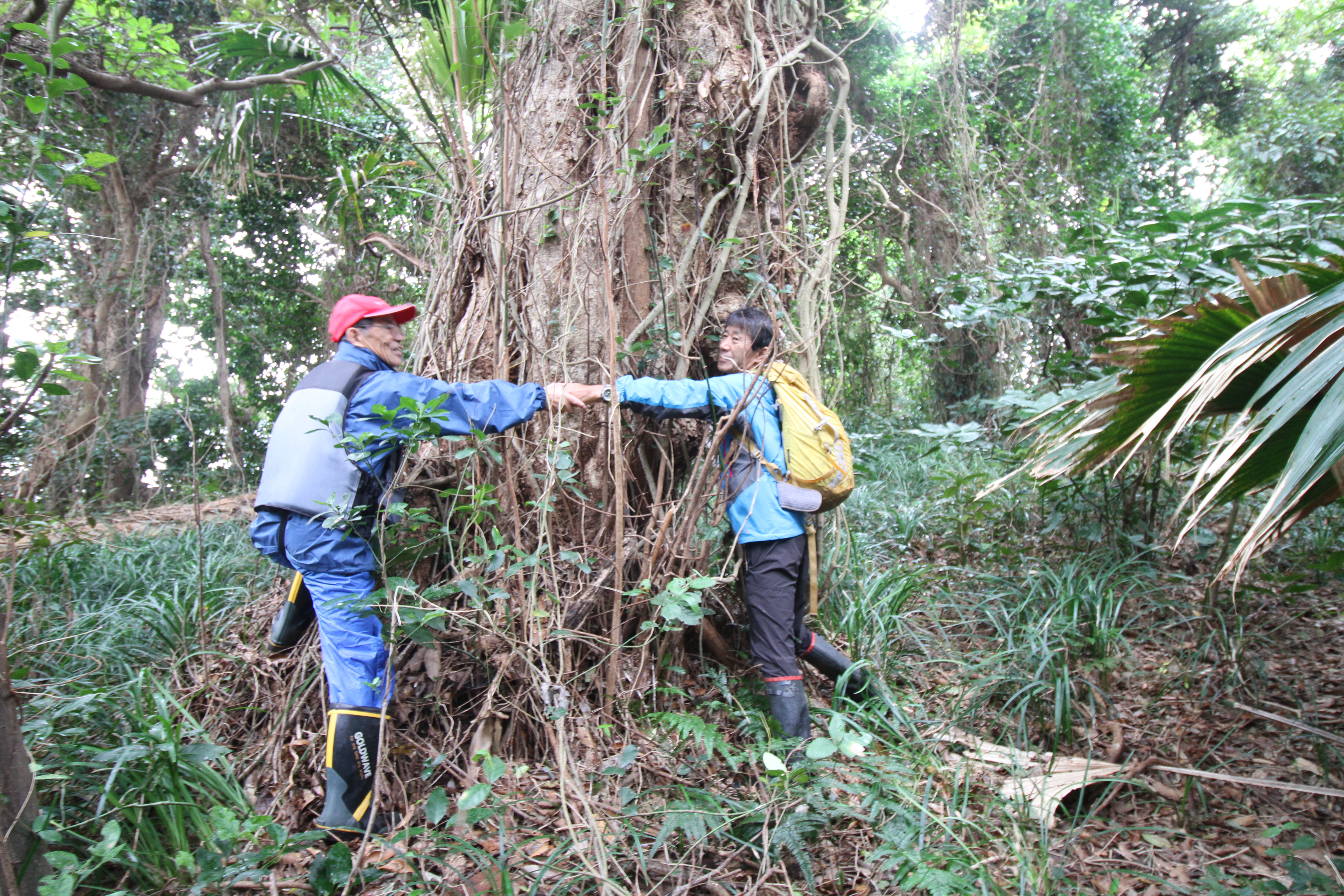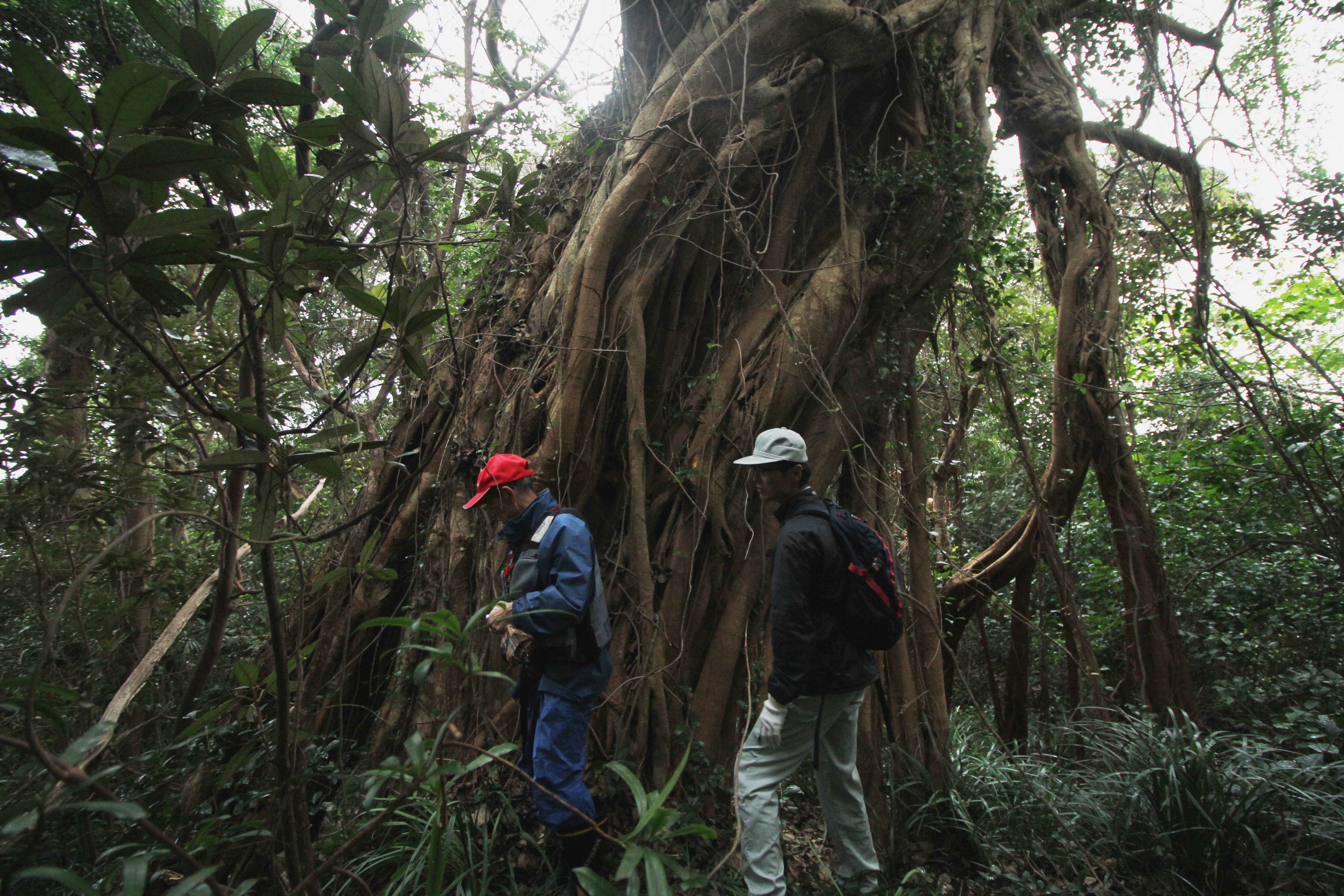 鬱蒼とした林内の足下はツタがはい、これが足に絡まり何度か倒れそうになりました。林内では、フウトウカズラ、ビロウ、アオキ、タブ、スダジイが目に付きましたが特に目立った樹木はアコウの大木。おそらく樹齢数百年はたっているだろうと思われる見事なものでした。林内に塹壕と井戸のような跡がありました。