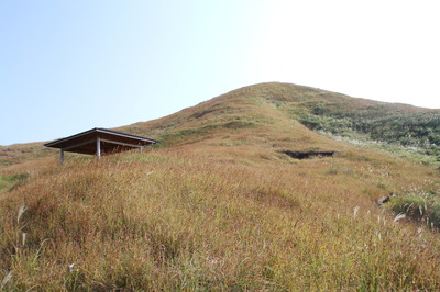 西側から北側にかけての斜面は、メカルガヤ、ススキ、チガヤが主の草原。東、南側は林