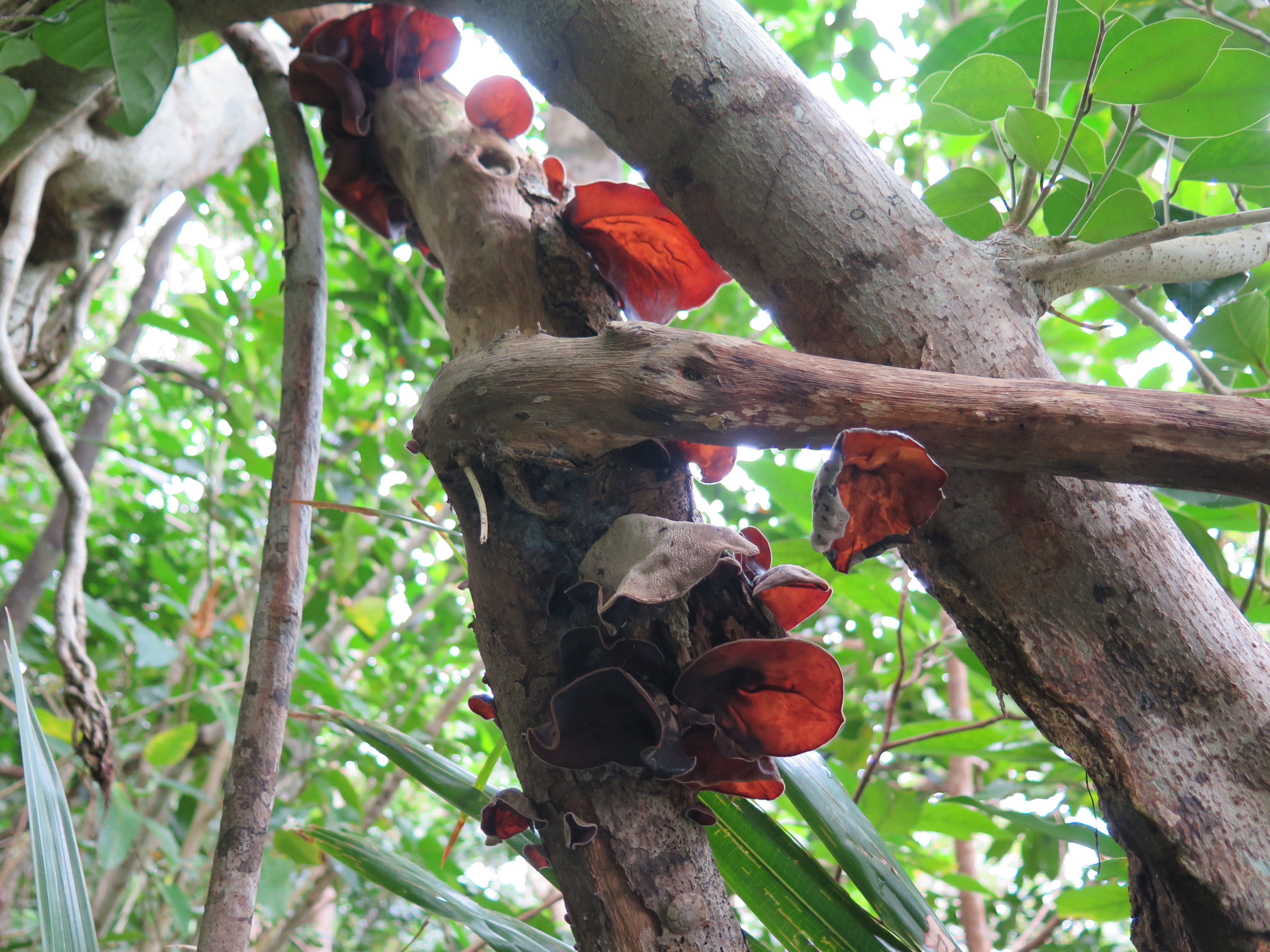 たくさんの大きなキクラゲも発見しました。朝方に降った雨のおかげで大きくかさが開き、おいしそうでした。与那国島ではキクラゲのことを「みんぶる=耳たぶ」と呼ぶそうです。