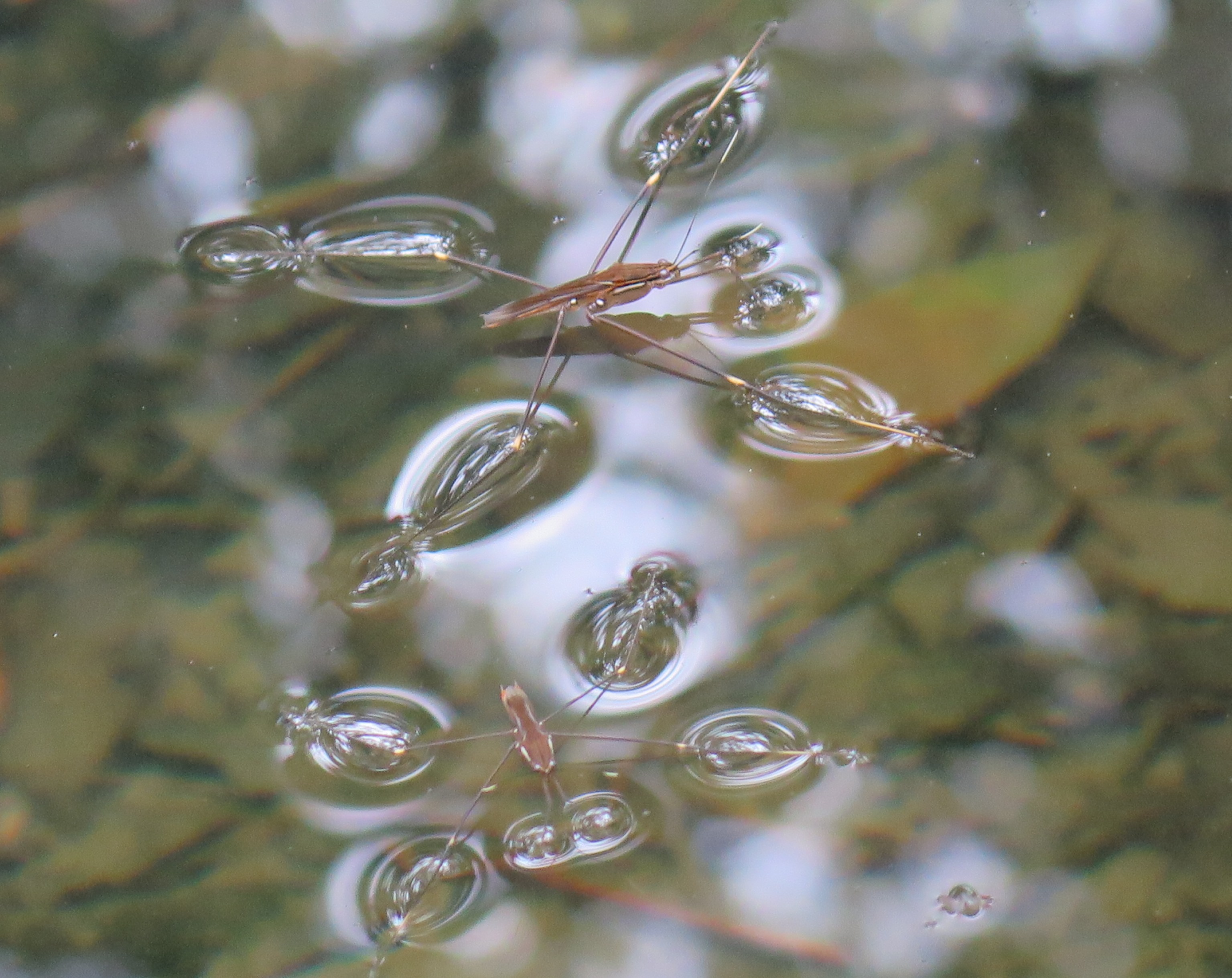 調査中、小さな沢に大きなアメンボが集まっていました。それは、トゲアシアメンボと呼ばれる日本では与那国島にしか生息していないアメンボでした。オスのほうがひとまわり大きく、あしにトゲがあることが名前の由来です。成虫は赤色の羽を広げて水面から直接飛び立ちます。最近では、農家の高齢化などが進み、生き物が棲みやすい水田などが減ってきているため、アメンボなどの水生昆虫が減少しています。