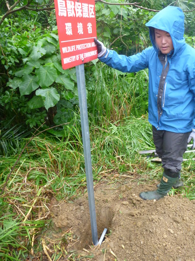 鳥獣保護区の制札の建て替え作業も行いました。台風で根元から折れたり曲がったりしていたためです。時間のない中で、建て替え作業を行うのは一苦労でしたが、必要なすべての制札を建て替えることができました。