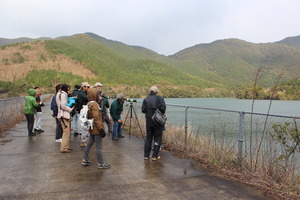 移動先の繁敷ダムには周辺を取り囲むスギ・ヒノキの森林から育まれた水が流れ込み、ダムの下流はゲンジボタルの名所となるなど自然が数多く残る場所です。前日の天気予報では曇りでしたが、終始風が強くダムに到着した頃から雪まじりの雨が降り始めました。野鳥に気付かれないよう、そーっとバスから降りて野鳥観察に向かいます。