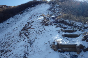 数年前に整備した階段が左側に崩落している。右側も急斜面