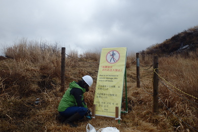 地面が緩くなっているため、山頂は霧が発生するとより危険であるため、阿蘇山遭難防止対策協議会にて注意喚起の看板とロープを設置しました。
