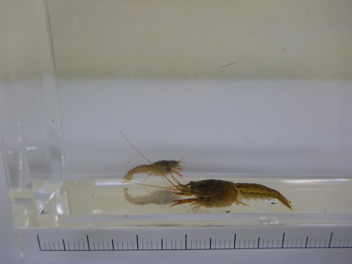 ▲池で捕獲したアメリカザリガニの幼体(体長:約2cm)