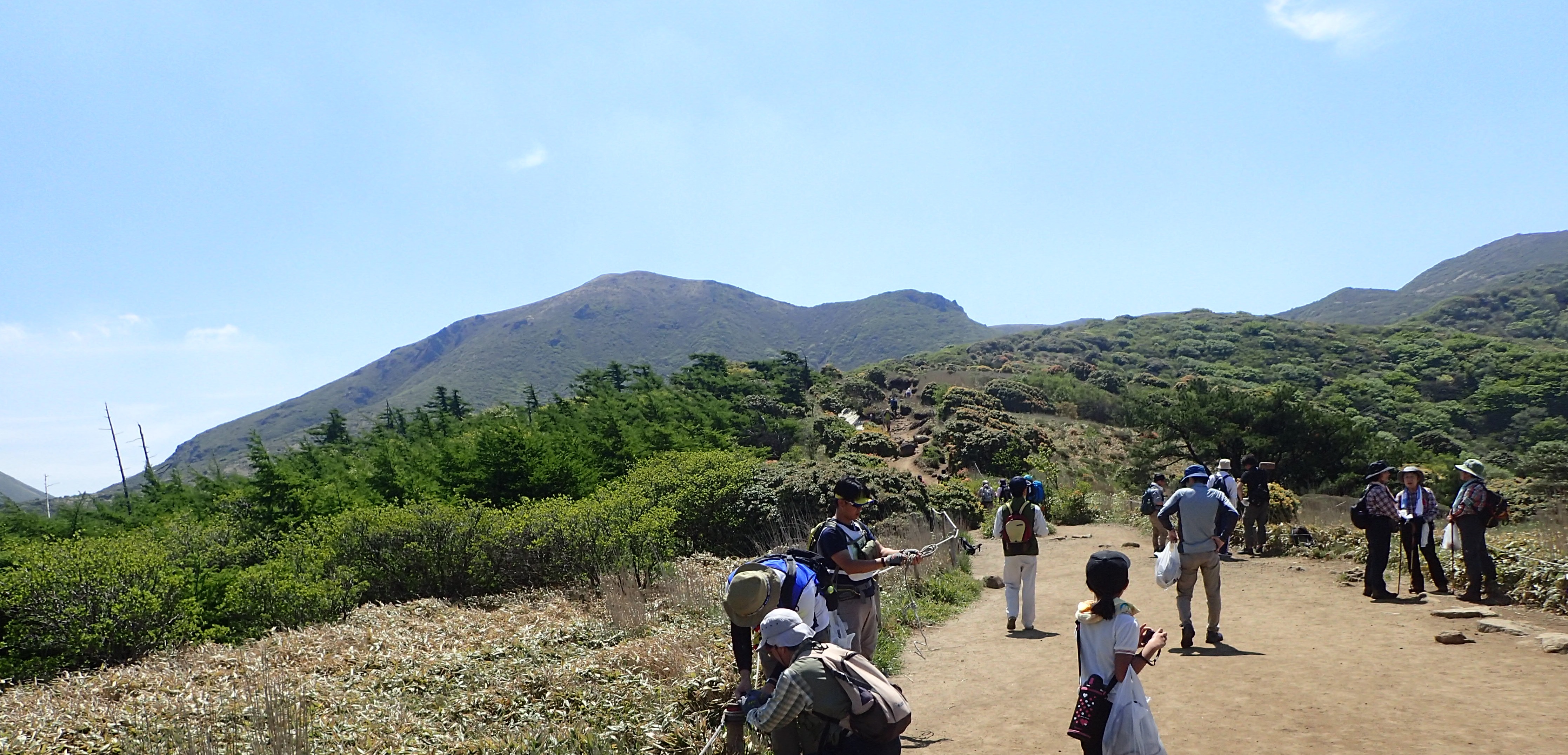 くじゅう連山では6月にはミヤマキリシマが満開になるので、その前に登山者の方を気持ち良く受け入れられたらという思いもあり、九州電力八丁原発電所の主催で、牧ノ戸峠登山道の整備、清掃を毎年恒例で行っています。当日は多くのボランティアの方が参加されて、約70名で活動を行いました。
