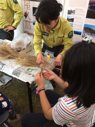 九州地方環境事務所ブースでは、「ススキのホウキ作り」と「ススキのフクロウ作り」体験を行いました。