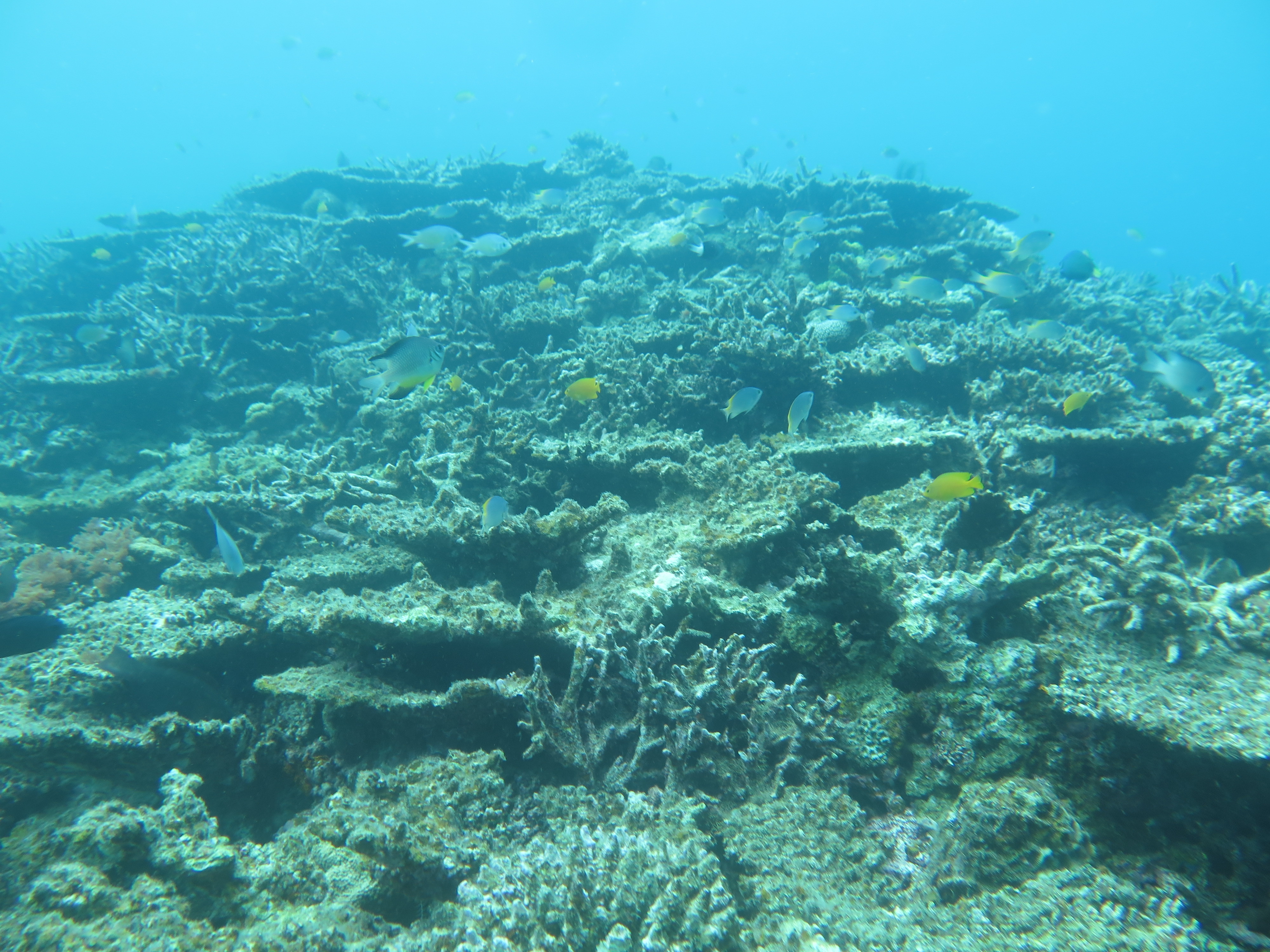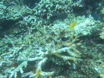 遠目で見ると、サンゴがたくさん残っているように見えますが・・。