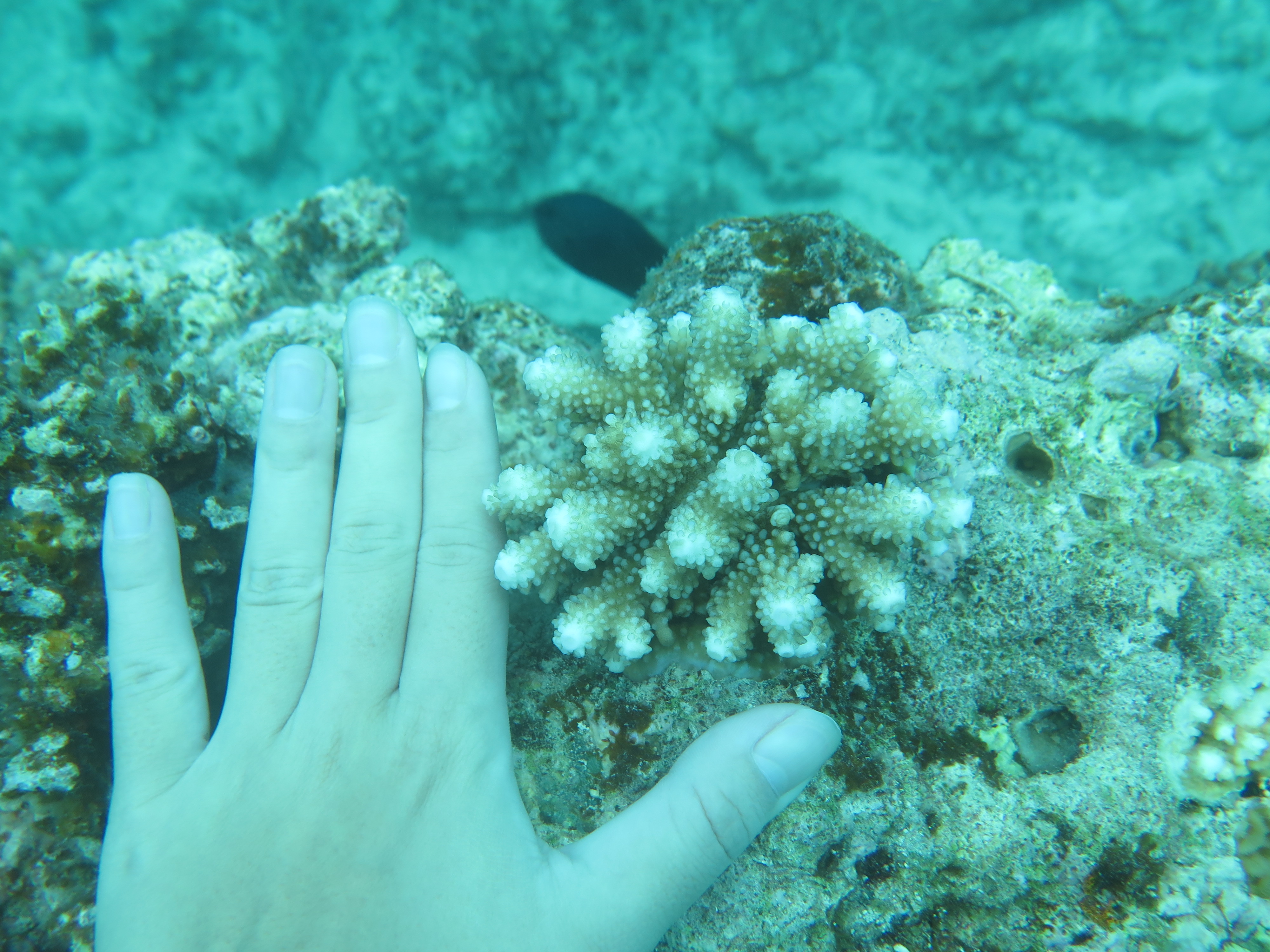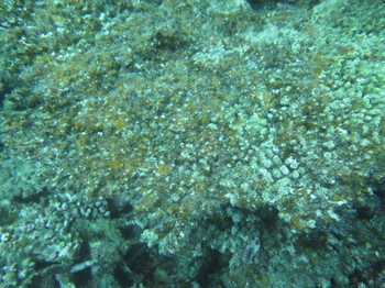 近づいてみるとサンゴに藻が生えているのが分かります。