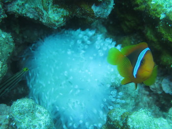 未だに白化しているイソギンチャク&威嚇するハマクマノミ