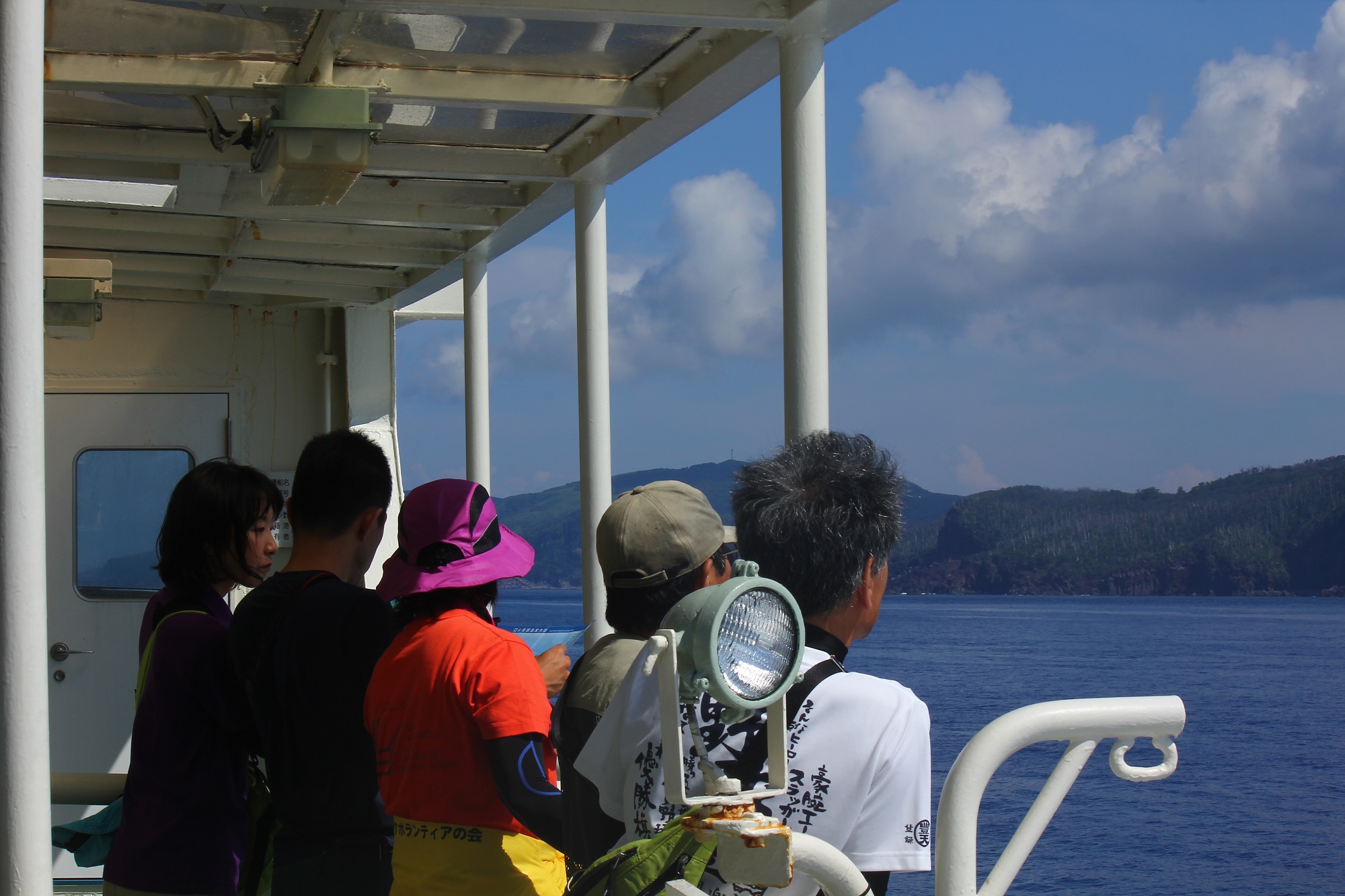 ▲甲板で景色を楽しむパークボランティアの皆さん。波が無かったので船は全く揺れず快適でした。