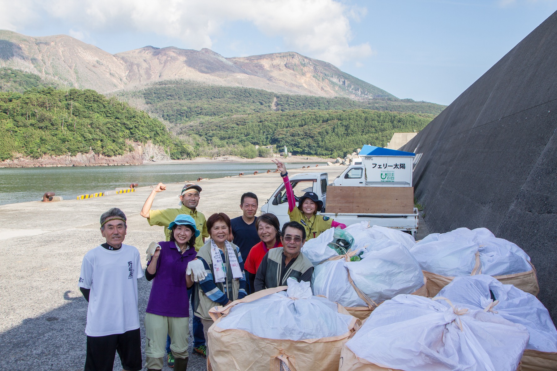 ▲回収したゴミが入ったフレコンバックと共に記念撮影。新岳をバックに。