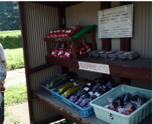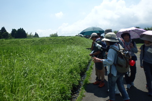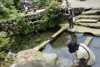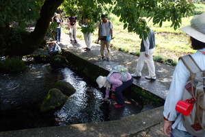 パークボランティアの案内で、まずは『池の川水源』へ。ここには兜(かぶと)石というものがあり、水量が多くこの石が見えなくなった年は雨が多く凶作と言われ、見えている年は日年(ひどし)で豊作になるという言い伝えがあるそうです。農家にとってはかんがい用水だけでなく、その年の豊凶を左右する重要な湧水地となっています。水源横には無人の野菜販売所があり新鮮な野菜にみんな興味津々。「トマトを水源で冷やして食べるのもいいね~!」と話もはずみます。