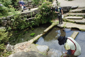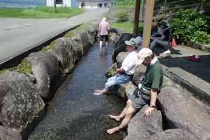 次は、環境省選定平成の名水百選の『湧沢津水源』へ。田園の真ん中で突然湧き上がるように噴き出しているのが湧沢津水源です。湧水量(毎分) 5トン で水の柔らかさも村内一と言われています。ちょうど地元の方が水を汲みに来られていました。ここは飲料水用、生活用水用と分かれており、太陽の熱い日差しの中、足を浸して涼を取るにはもってこい!しかし、長くつけていると痛くなるくらいでした。