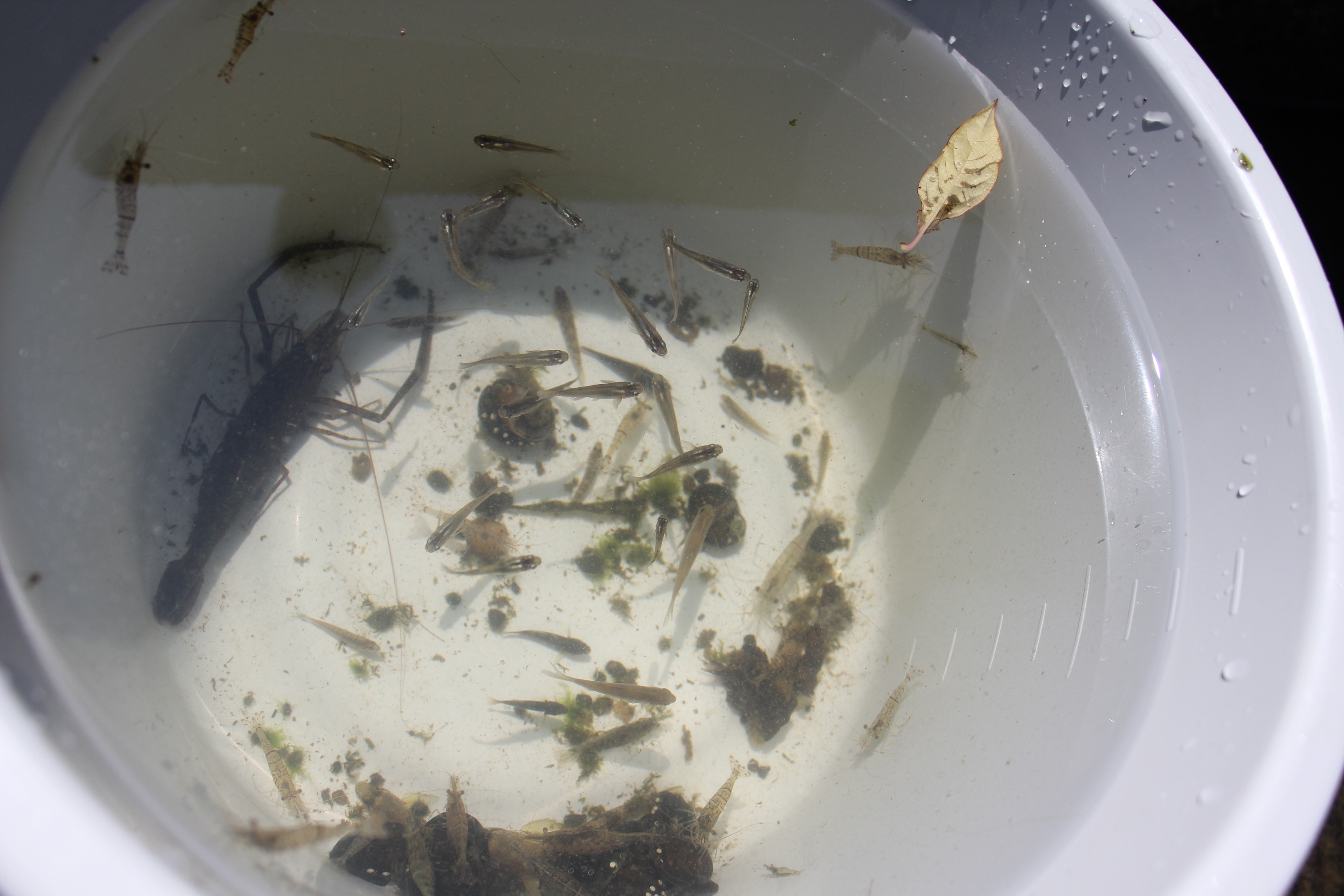 網の使い方にも慣れいろんな生きものを採集できたので、川から上がってスタッフから生きものの名前や特徴について説明をしました。中でも一番大きかったのは、テナガエビ。バケツの中でひと際目立っています。お父さんたちは、50cmほどの白色のナマズやコイ、カワムツを見つけたものの、残念ながら逃げられてしまったそうです。