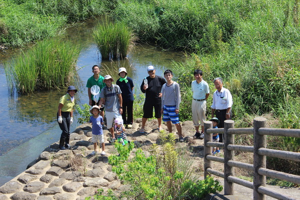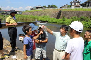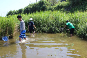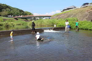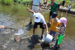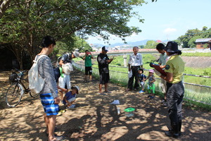 川の流れは緩やかで、小さな子供でも安心して歩けるぐらいの水深です。遠くから見るとどこに生きものがいるのか分かりませんでしたが、じっくりと見ているといろんな生きものが見えてきました。我を忘れて魚を追っかけていた参加者も、魚のすばしっこさにはなかなか勝てなかったようです。