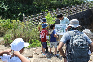 2017年08月28日こんにちは!五島自然保護官事務所の竹下です。7月30日(日曜) 、大円寺公園近くを流れる福江川で開催した「福江川探索隊」にスタッフとして参加しました。川でのふれあい事業は昨年度にはない企画のため、子供たちに興味を持ってもらえるのか心配でしたが、広報誌へ掲載してすぐ問合せが殺到し数日で定員に達しました。残念ながら前日数組の家族のキャンセルがありましたが、スタッフによるSNS等での呼びかけで急遽当日参加可能としたところ、ほぼ予定していた人数で開催することができました。