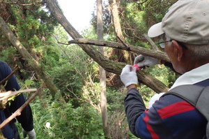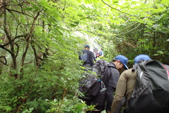 このルートは、佐保国立公園管理官以下4名が同行されました。急傾斜場所が多く、降雨後であったことから足下が滑りやすく、林内の歩道は洗掘が目立ったようですが、通行には問題ないとのこと。
