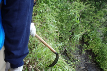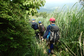 2017年08月28日阿蘇山遭難防止対策協議会が取り組んでいる登山ルート点検の『根子岳ルート』に参加しました。今回は、合同パトロールの第2回目、前原牧場登山口から東峰までは全員で登頂し、登山道ルートの判別や、登山道沿いの草が繁茂して被さっていることから草刈りと、ルート上を被圧している枝打ち、ロープ等の補修を行いました。平成24年の水害や昨年の熊本地震などにより崩落した箇所が見えるよう注意しながら行いました。