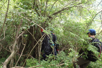 看板や過去のピンクテープを辿って進みましたが道が分かりにくく、野焼き放棄地の雑木や、水害後の倒木に行く手を阻まれると、迷いやすいことが想定されます。森林や草原の手入れの必要性を感じました。