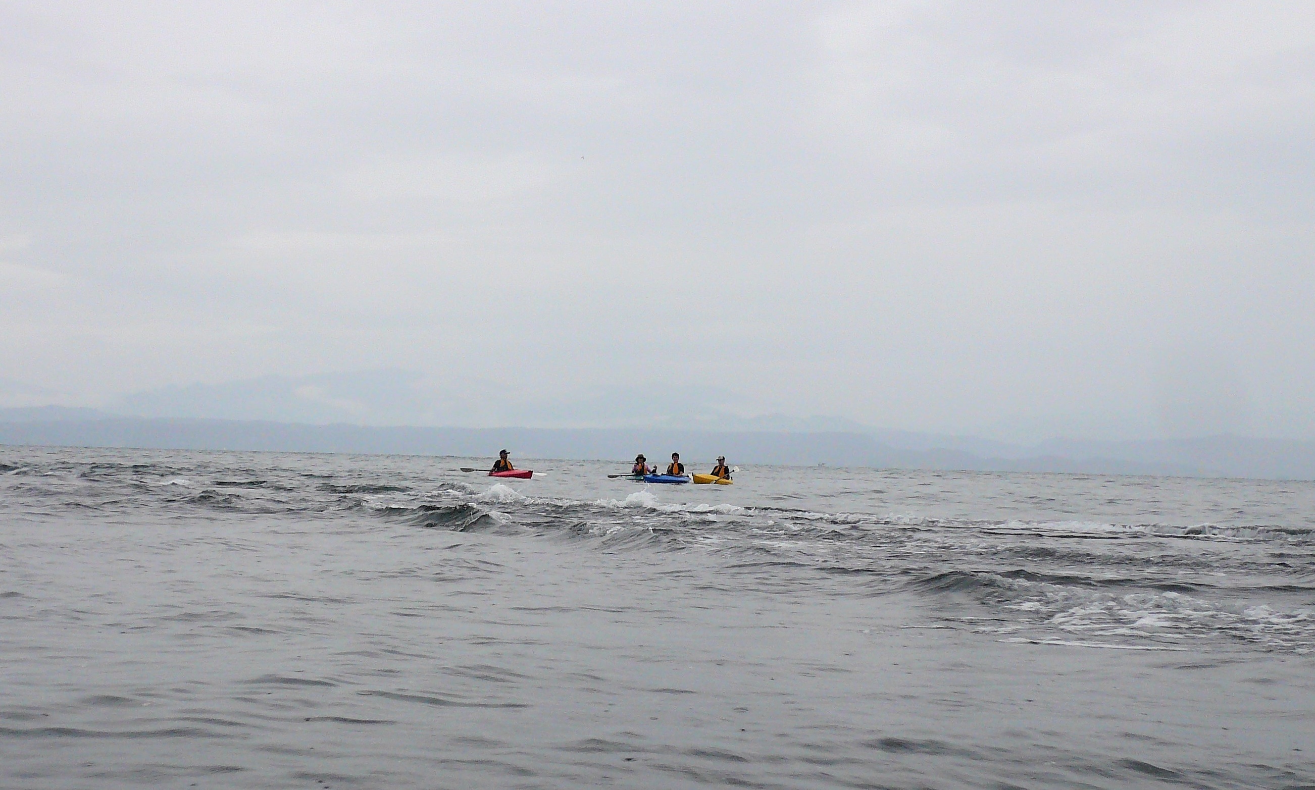また、普段は潮が引いたときに歩く知林ヶ島への砂の道ですが、今回は道が現れる干潮前にカヤックで乗り越えてみました。北上する潮の流れと、南下する潮の流れがぶつかる場所。北からも南からも持ってこられた砂がこんもり盛り上がって、カヤックの底がついてしまいそうです。カヤックの真下にある砂が数時間後には歩いて渡れる道になるなんて、不思議。やはり陸上から見るのと海の上から見るのとでは、感じるものが違いますね。