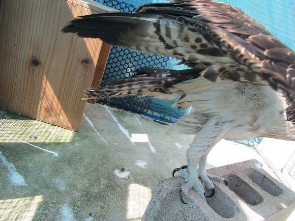数日かけて体調は改善傾向にあったものの、事故の影響で右翼の初列風切り羽をほぼ失うという鳥にとっては致命的な状態に・・・。過去の救護例から初列風切り羽は先端部分が4枚なくても飛翔に問題はありませんでした。しかし、西17-03のように9枚もなくなってしまうと上昇に必要な推進力を得られずピョンピョンと地面を飛び跳ねることしかできませんでした。