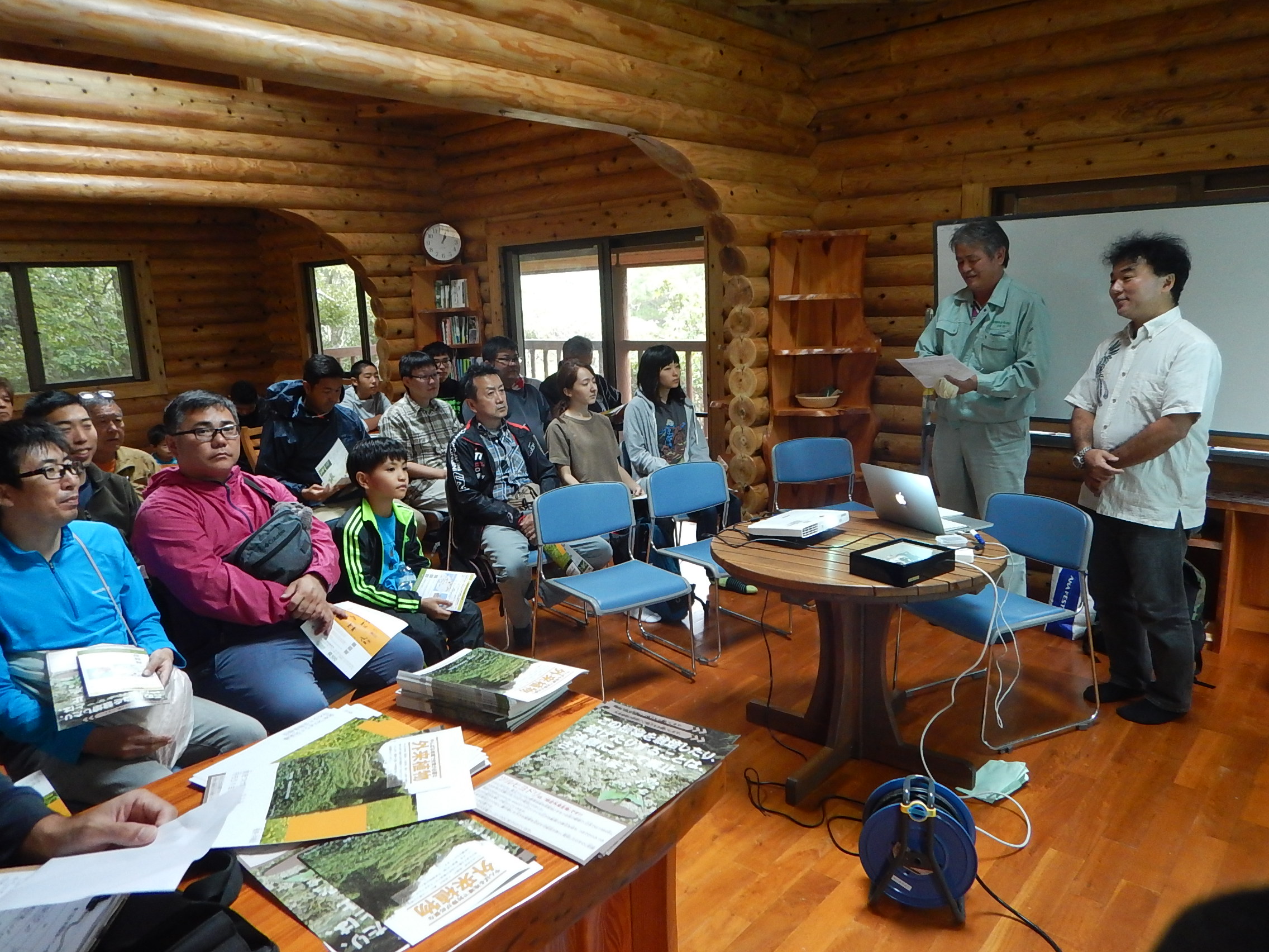 右の荒谷先生からクワガタ・カブトムシを中心に昆虫の楽しい世界をお話してもらいました。その後、私から外来植物について話した後はいよいよ外に出て駆除に向かいます。