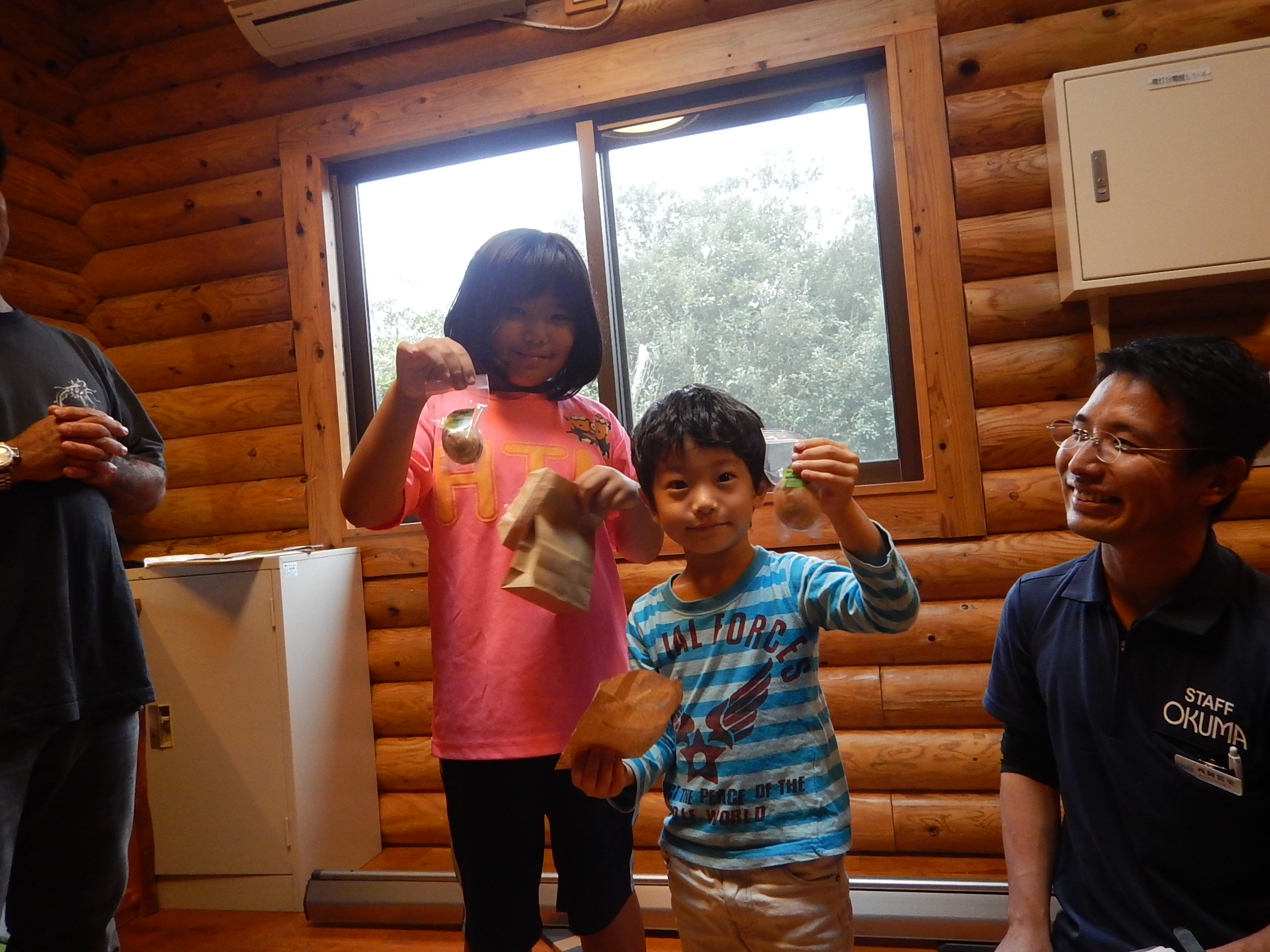 アメリカハマグルマをちぎることなく長―く抜き取れたり、タイワンカブトムシを沢山見つけたトップ3のみんなには、国頭村森林組合から素敵なプレゼントがありました。