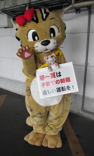その後、市内のスーパーの駐車場でチラシを配布しながら、人とヤマネコに優しい運転を呼びかけました。小さな未来のドライバーから年配の方まで、つばきちゃんは大人気でした。