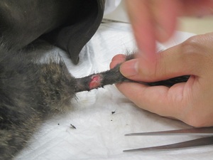 保護センターへ持ち帰り診察の結果、13日のメス個体と同様に痩せていて血液検査の値も正常値ではなく尻尾には裂傷がありハエに産卵され孵化した幼虫に食べられていたことから、そのまま収容ということになりました。