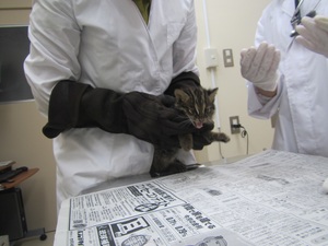 その間に職員と専門家の相談の結果、一時的に保護して健康診断を行うことになりガラス玉の山から出てきた仔猫を無事捕まえました。