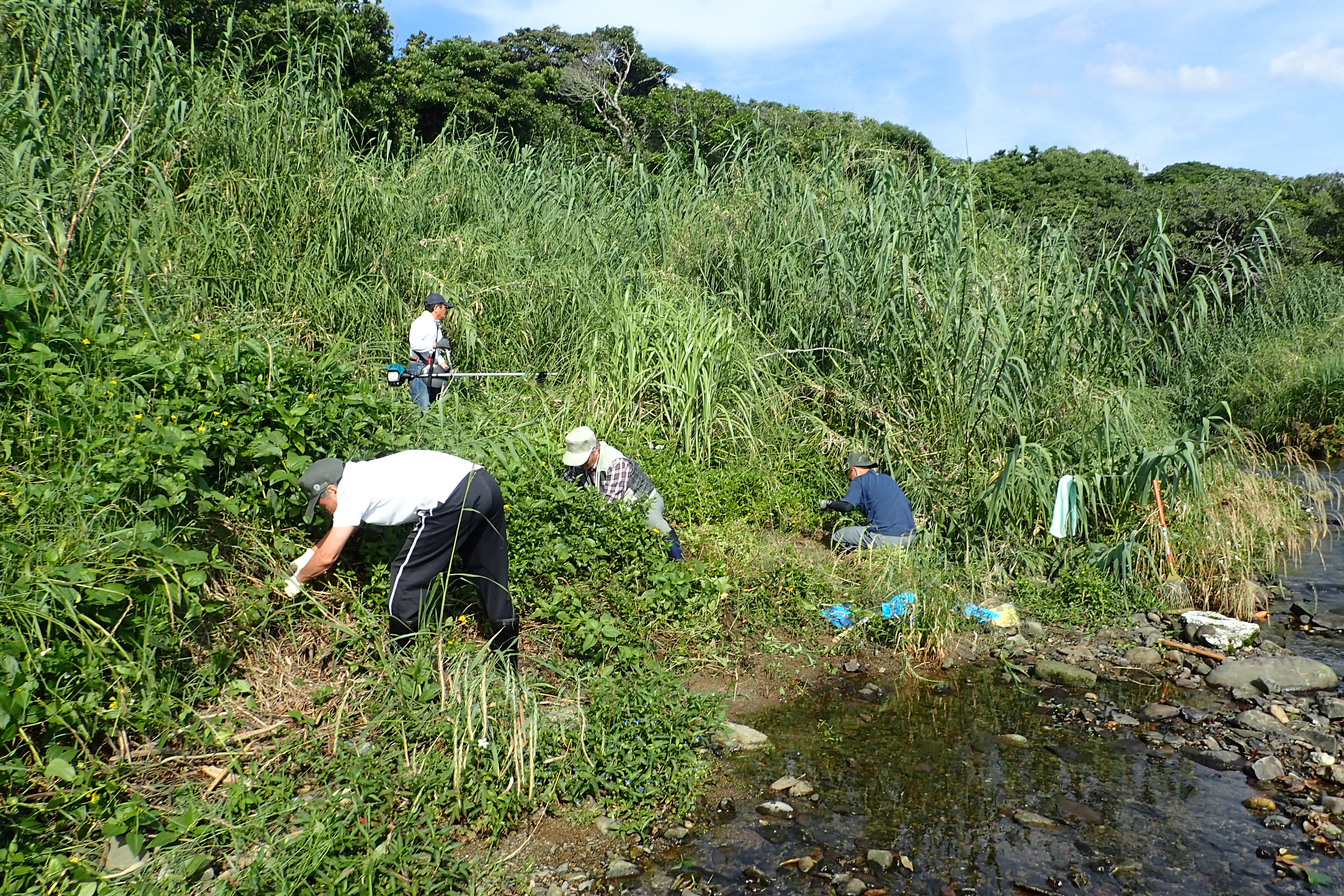 ▲川沿いのアメリカハマグルマを駆除するボランティアのみなさん。