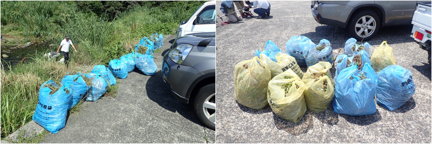 ▲2箇所で合計33袋のアメリカハマグルマを駆除しました。