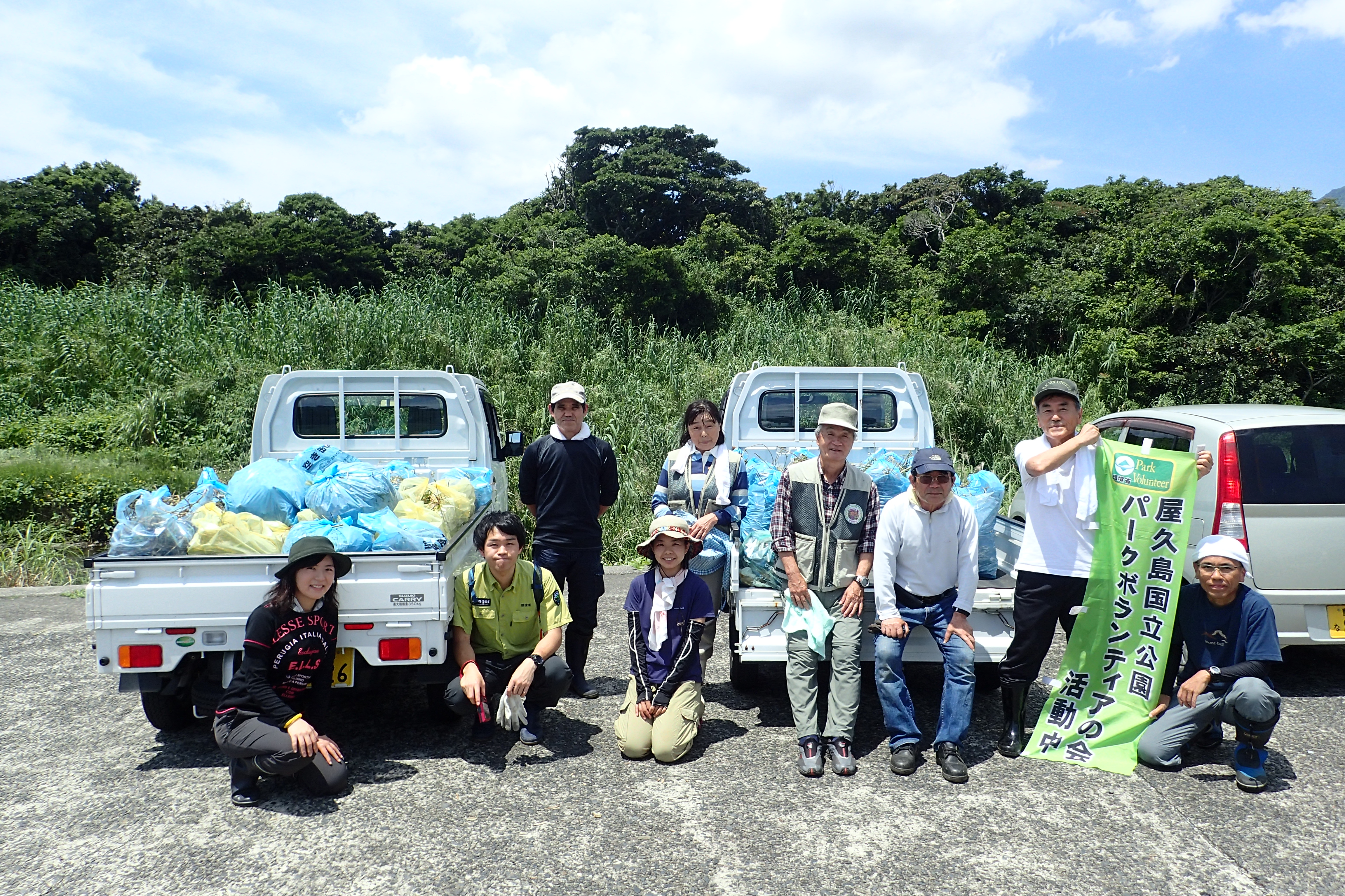 先月実施した屋久島国立公園パークボランティアの外来種(アメリカハマグルマ)駆除活動in春田浜が、あいにく雨天の為途中で中止となったことから、再度駆除作業にご協力頂けるパークボランティアの方を募り、6月2日(土)に駆除を実施しました。
