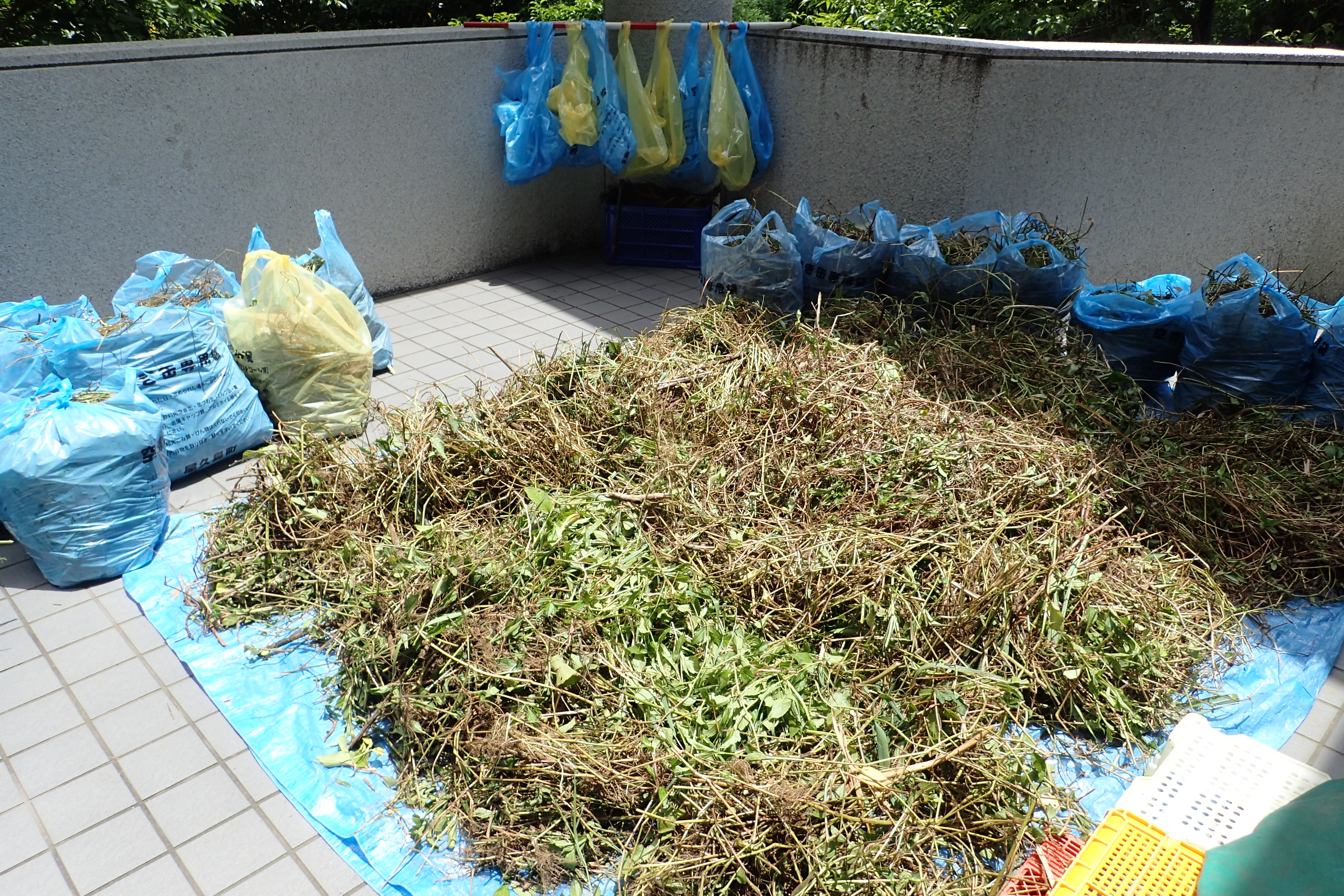 ▲草の上部を草刈機で刈り取り、引き抜きやすくしてから根から抜き取りました。