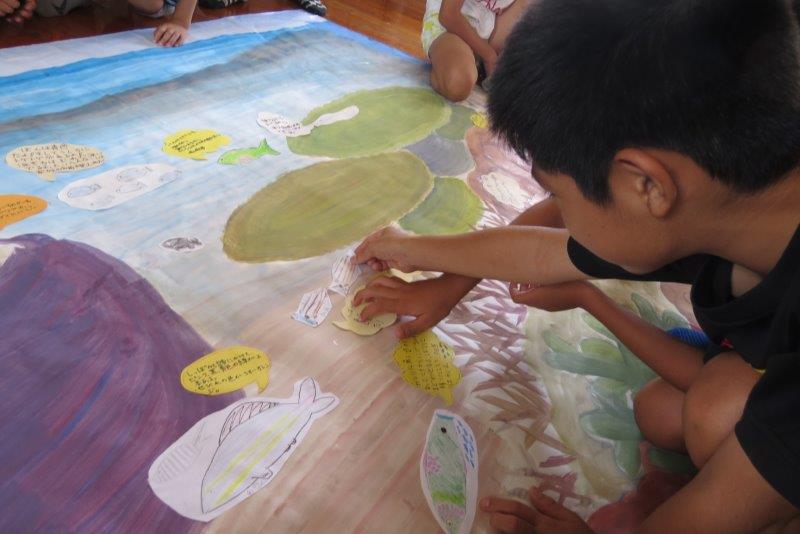 スノーケリングでみた生き物を絵に描き、模造紙に貼っていきます。(川平小学校)