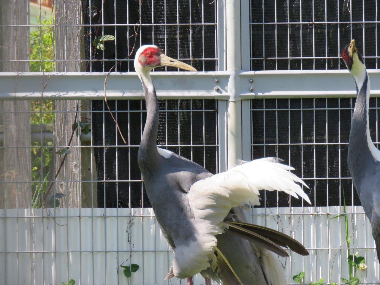 ▲飼育ゲージの見学(左)/現在保護飼育されているマナヅル。翼が折れて飛べなくなった個体です。(右)