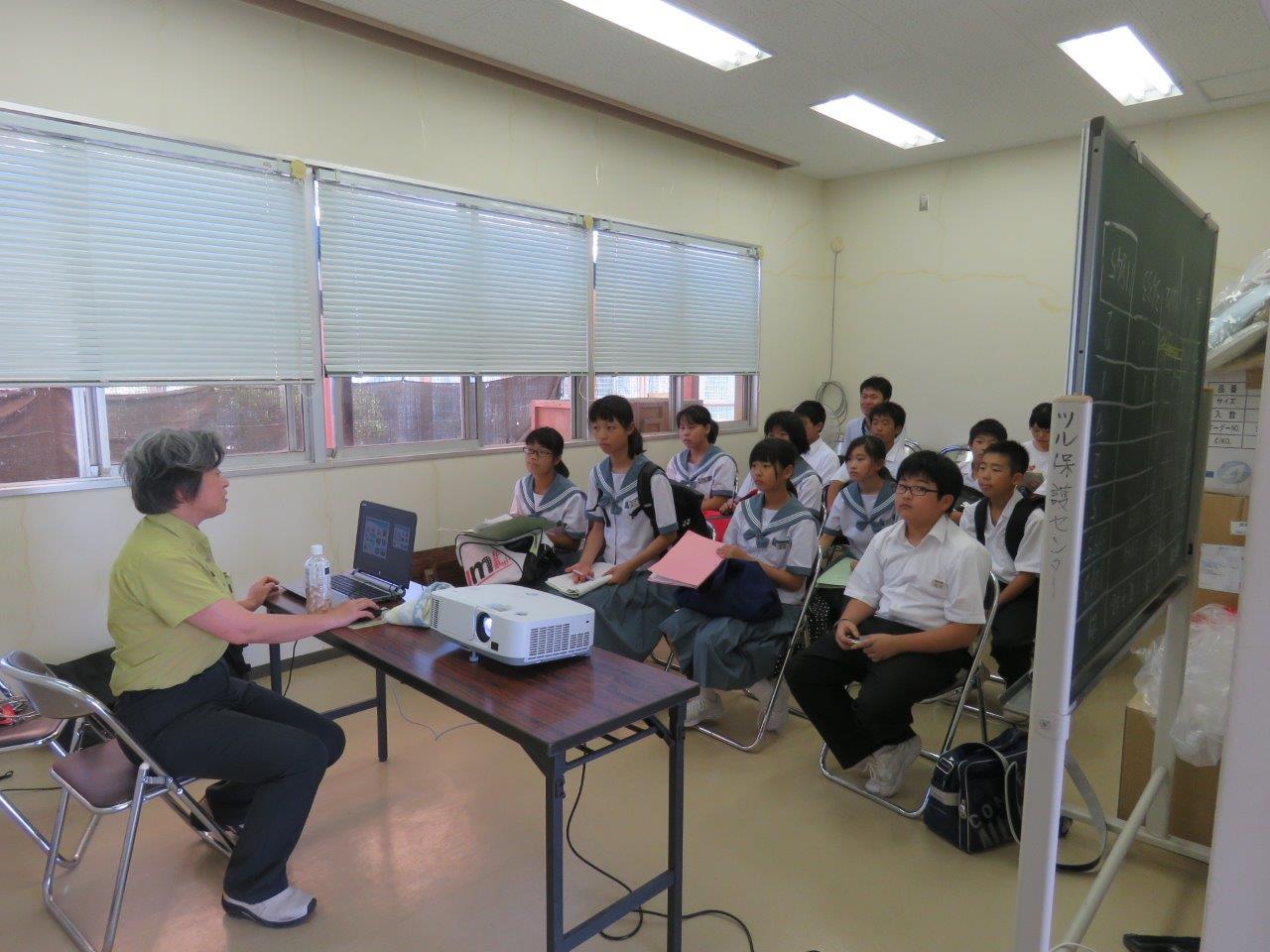 授業では、「そもそも鳥インフルエンザってなに?」「環境省や出水自然保護官事務所ではどんなことをしているの?」という観点から、まず、鳥インフルエンザウイルスとは何か?や社会に与える影響、環境省で行っている野鳥の高病原性鳥インフルエンザ対策、鳥インフルエンザが発生した時に現場で実施する死亡野鳥パトロールについて解説しました。また、業務の話題以外にも、レンジャー/アクティブレンジャーのお仕事のやりがいや大変なところ等を紹介しました。