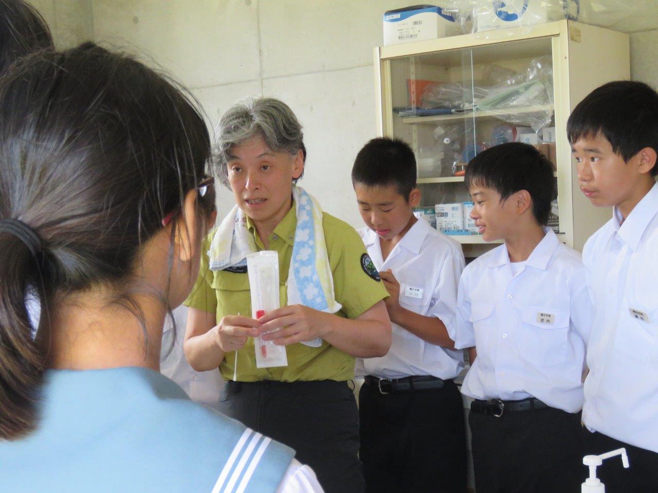 ツルの治療等を行う処置室では、鳥インフルエンザ簡易検査の方法・手順を検査キットやナベヅルのぬいぐるみを用いてデモンストレーションしました。