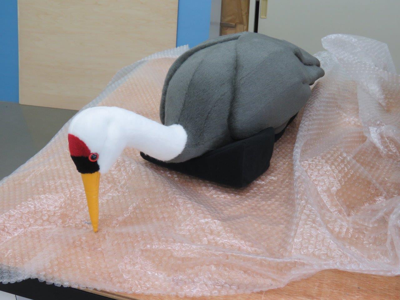 ▲鳥インフルエンザ簡易検査の手順を解説(左)/ナベヅルのぬいぐるみ(右)