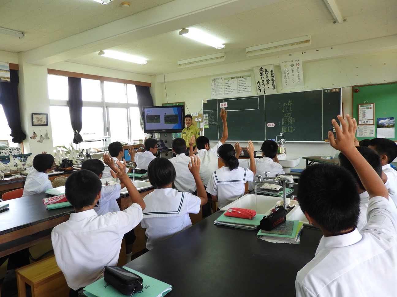 外来種のお話のあとは、生徒は、先生が作成したワークシートをもとに夏休みの自由研究のテーマ選びや計画表を悩みながらも自分が興味のあるテーマを記入していました。自由研究のテーマには、雨水のPH調査、アリの生態、釣りで釣り上げた魚の種類、いきもの調べ、洞窟調べなど色々上がっていました。