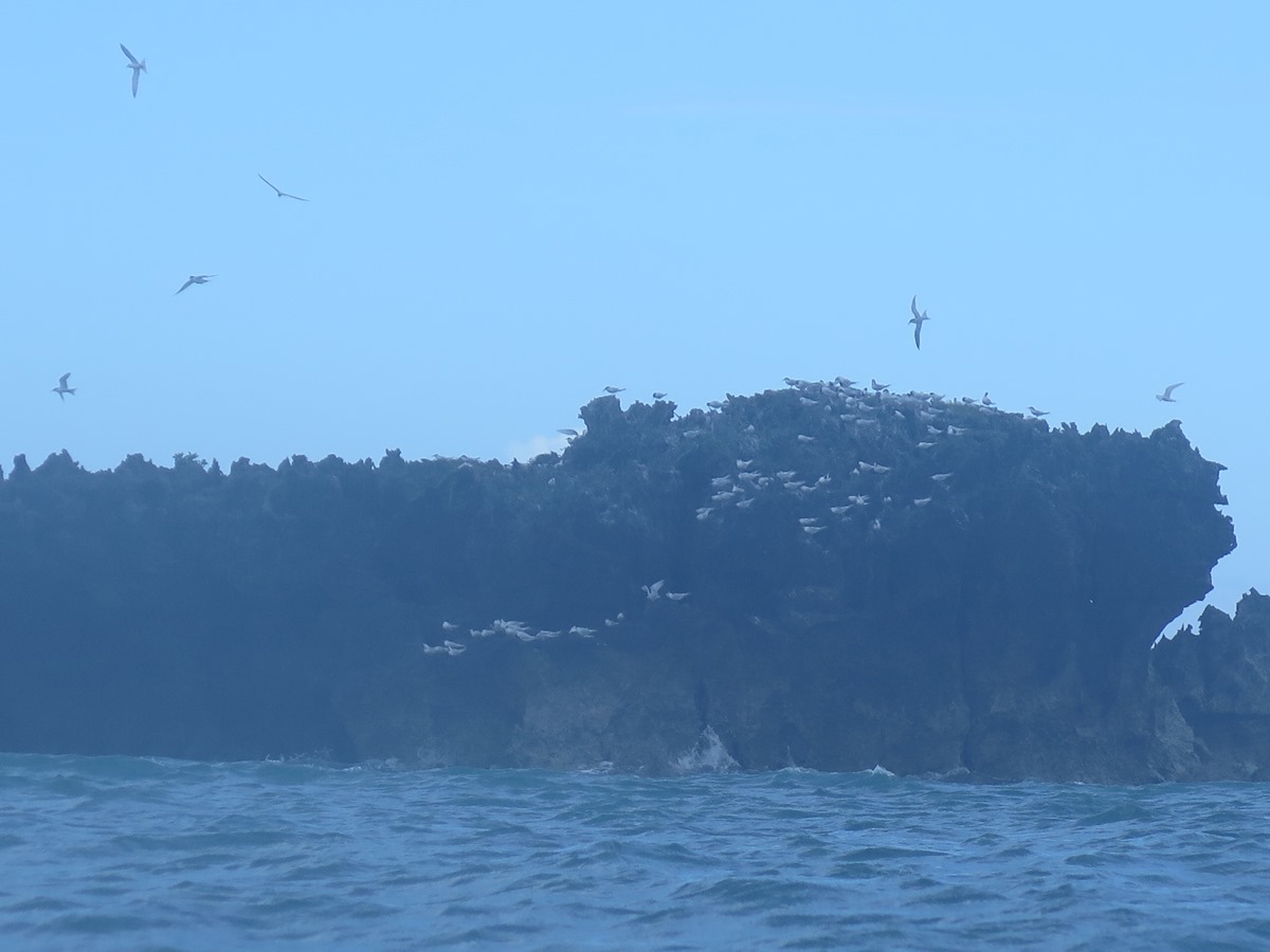 岩礁には、目の黒いラインが特徴的で全身が白い羽毛で覆われたエリグロアジサシの群れを観察することが出来ました。沖縄には、繁殖のために夏の時期に飛来します。