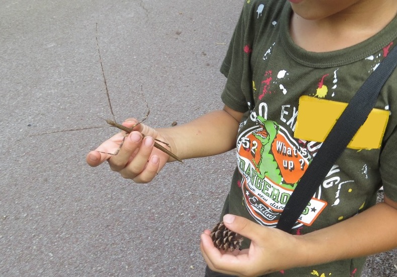 その後、講師の案内のもと、野外に出て公園内を散策して、見つけた生き物を触ったり、鳴き声を聞いたりしながら、みんなで生き物を探して歩いていきました。