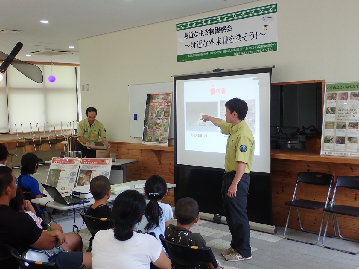 はじめに室内で、身近な生き物の鳴き声クイズを行いました。似たような鳴き声のヤエヤマニイニイとイシガキニイニイのセミの鳴き声を言い当てられたお子さんもいたりして、すごくびっくりでした。また、石垣島で増えてしまい生態系に悪影響を及ぼしている特定外来生物のオオヒキガエルの説明を行いました。ペットを飼う前には、しっかりと家族で話合って飼うことなどをお伝えして、外来種を増やさないためにみんなができることについてお話をしました。