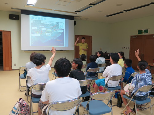 まずは国立公園の話や米原海岸の話、そして石垣島のサンゴの話などのレクチャーを行い、その後、講師の方から海で泳ぐ上での注意事項の話をして頂きました。