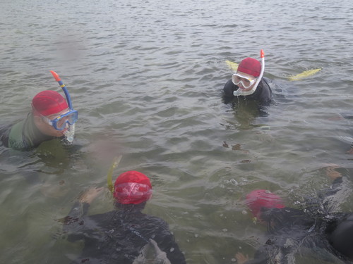 そして、いよいよ海に向かい、海岸で器材を合わせスノーケリング開始です。
