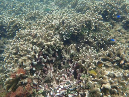 ここ真栄里海岸は市街地からすぐ近くの場所であるにも関わらず、ユビエダハマサンゴ群落が広がり、石垣島の中でもサンゴ被度の高い場所である隠れたスノーケリングスポットでもあります。