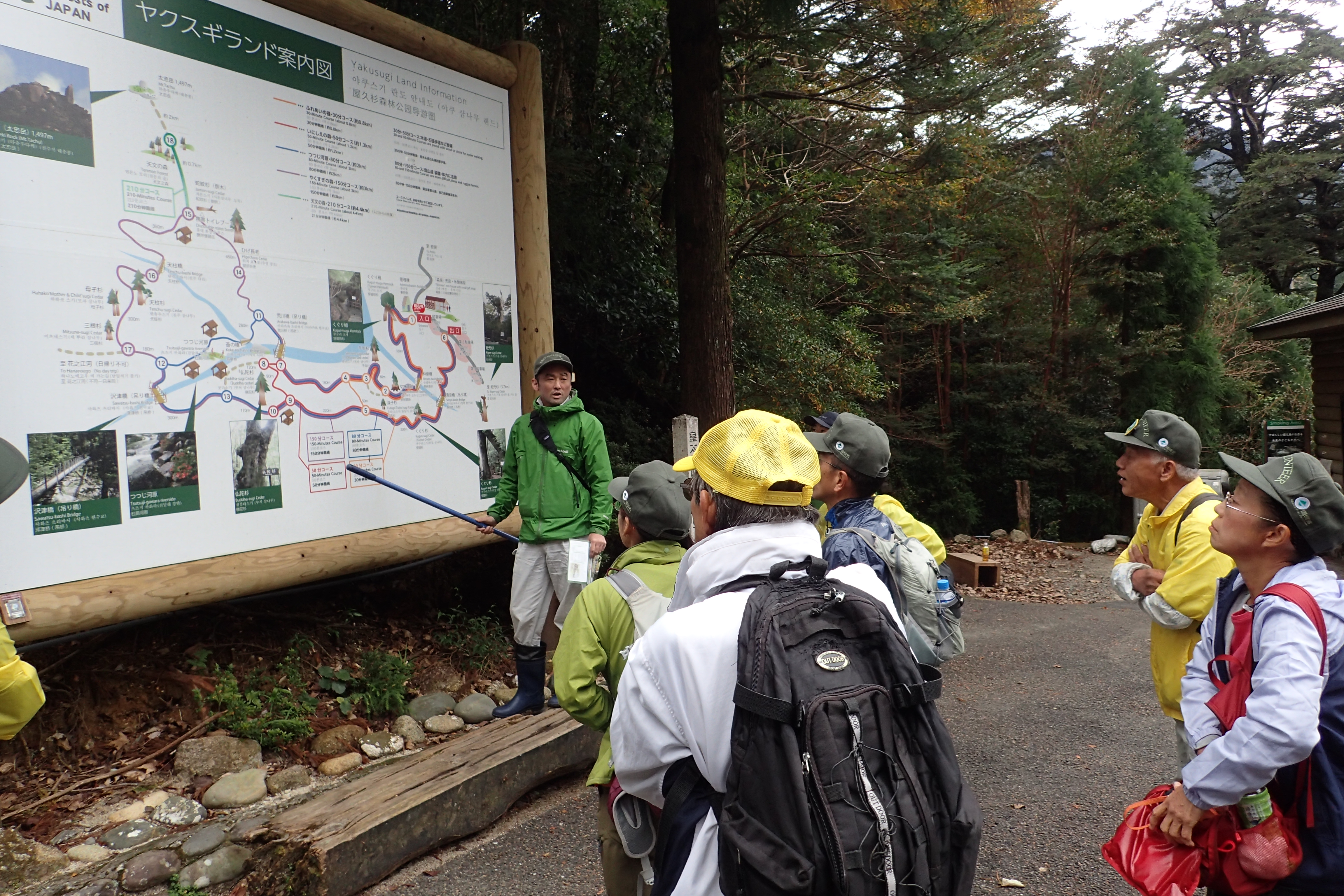▲レクチャーの様子。ヤクスギランド入口の大きな案内図を使って場所を確認。